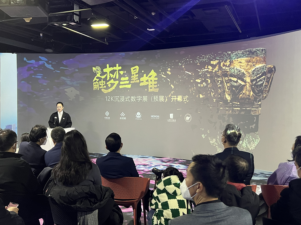 12月29日下午,由中国文物交流中心、四川省文物局指导,中央广播电视总台视听新媒体中心(央视频)、中国文物交流中心展览馆、四川省文物考古研究院、四川广汉三星堆博物馆、中创文保科技发展(北京)有限公司主办的“触梦三星堆——12K沉浸式数字展(预展)”在中国文物交流中心展览馆、深刻数字博物馆(筹)举行开幕式。民族文化宫博物馆馆长陶颖应邀出席。