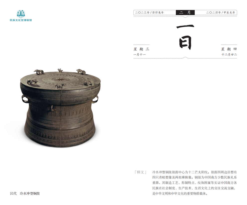 《国宝日历》收录西部十二省(自治区、直辖市)19家相关博物馆馆藏精品文物图片及文字介绍,兼具文化性与实用性,是制作精美的文化创意产品。民族文化宫博物馆藏品收录于年历中的二月部分,展示了冷水冲型铜鼓、五股佛像柄铜铃双头五股铜杵、“象州磨勘司新朱记”铜印等29件精品文物。