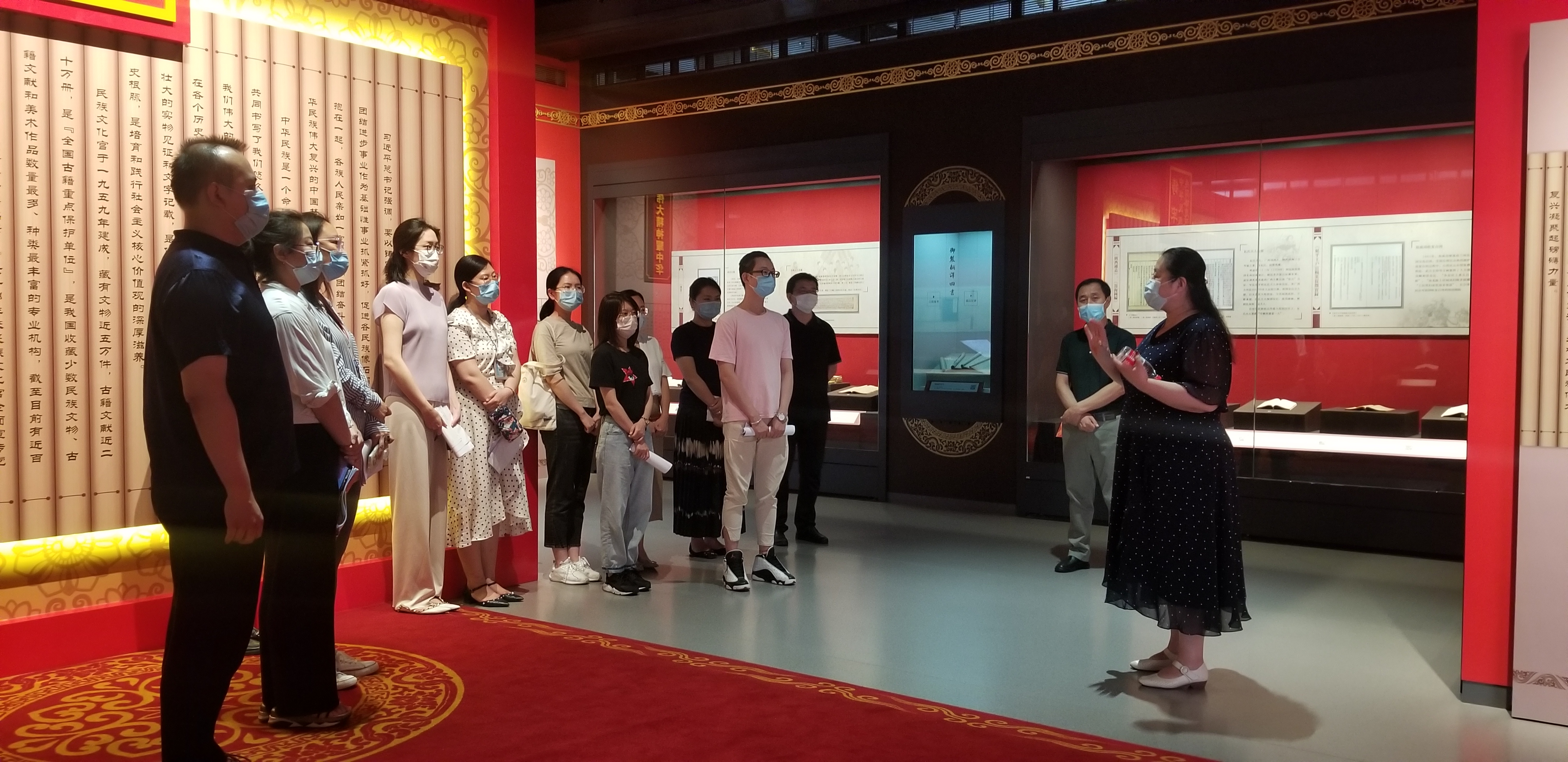 ▲民族文化宫党委委员、总会计师徐莹检查指导“册府撷珍——民族文化宫典藏古籍精品展”讲解工作
