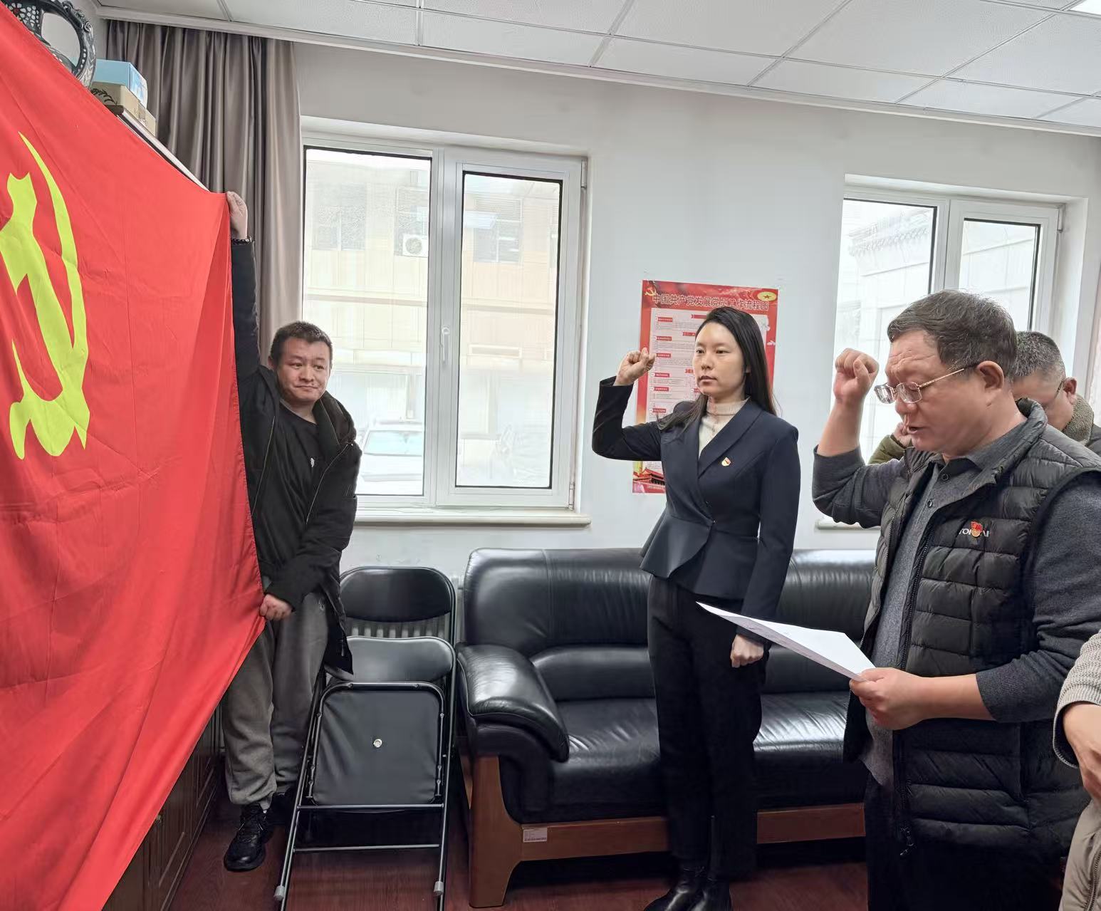 在党支部书记张兴洪的领誓下,新党员周霄霁面对鲜红党旗,庄严宣誓加入中国共产党。支部全体党员一同肃立,紧握右拳,以铿锵有力的誓言重温入党初心。仪式庄重严肃,是一次深刻的党性淬炼与思想洗礼,使全体党员的身份认同感、政治责任感和为民服务宗旨意识得到进一步巩固和升华。