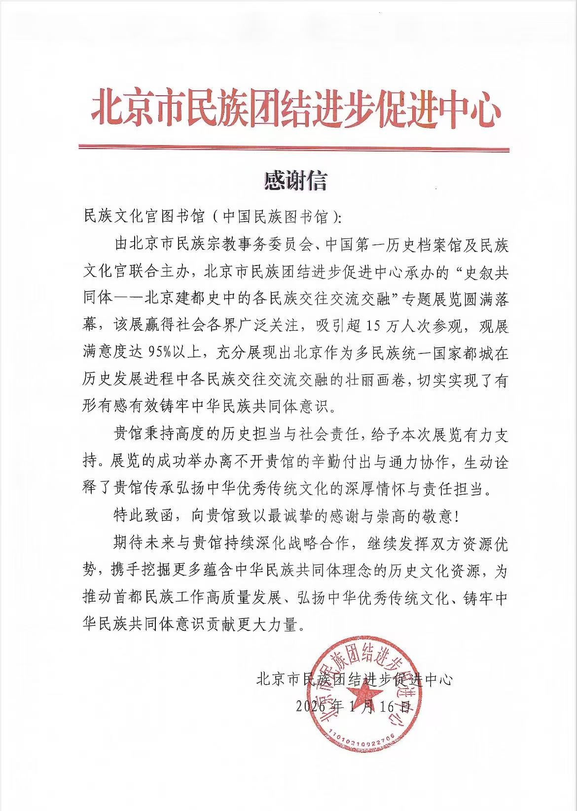 近日,北京民族团结进步促进中心致信感谢图书馆在其承办“史叙共同体——北京建都史中的各民族交往交流交融”专题展期间提供的帮助与支持,说到“图书馆秉持高度的历史担当与社会责任,为本次展览给予了有力支持”。