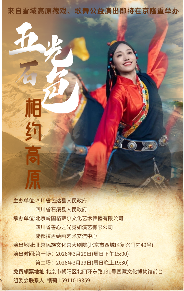 相约3月29日民族文化宫大剧院,《五光石色 相约高原》以歌为媒、以舞为韵,带您跨越山海,触摸色达与石渠的文化根脉,聆听青藏高原的千年回响,共赏一场不可错过的非遗艺术盛宴!