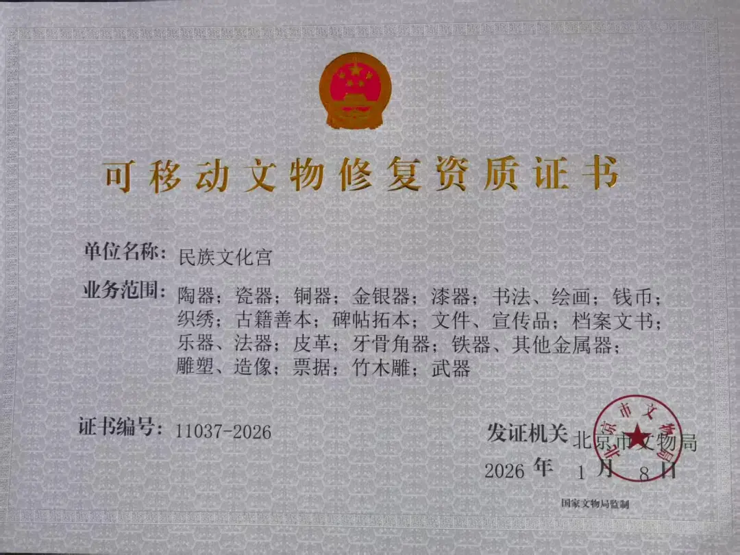 近日,民族文化宫传来重磅喜讯,经北京市文物局严格审核与逐层审批,正式获得可移动文物修复资质证书,业务范围涵盖20个常规性可移动文物修复业务类别,这标志着民族文化宫正式跻身国内少数兼具民族文物特色与常规品类修复能力的文博机构行列,迈入文物修复领域规范化、专业化、制度化新阶段。此次资质认定,既是对民族文化宫60多年深耕民族文物保护修复与研究工作的高度认可,更是对新时代民族文博事业高质量发展的殷切期许。