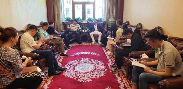 2019年5月27日上午,民族文化宫博物馆馆长兼展览馆馆长们发延,与中国农工党中央文化体育工作委员会副主任、北京非物质文化遗产发展基金会理事长陈四光,北京非物质文化遗产发展基金会常务副秘书长、大国非遗工匠专项公益基金管理委员会主任张树伟一行洽谈展览合作事宜。
