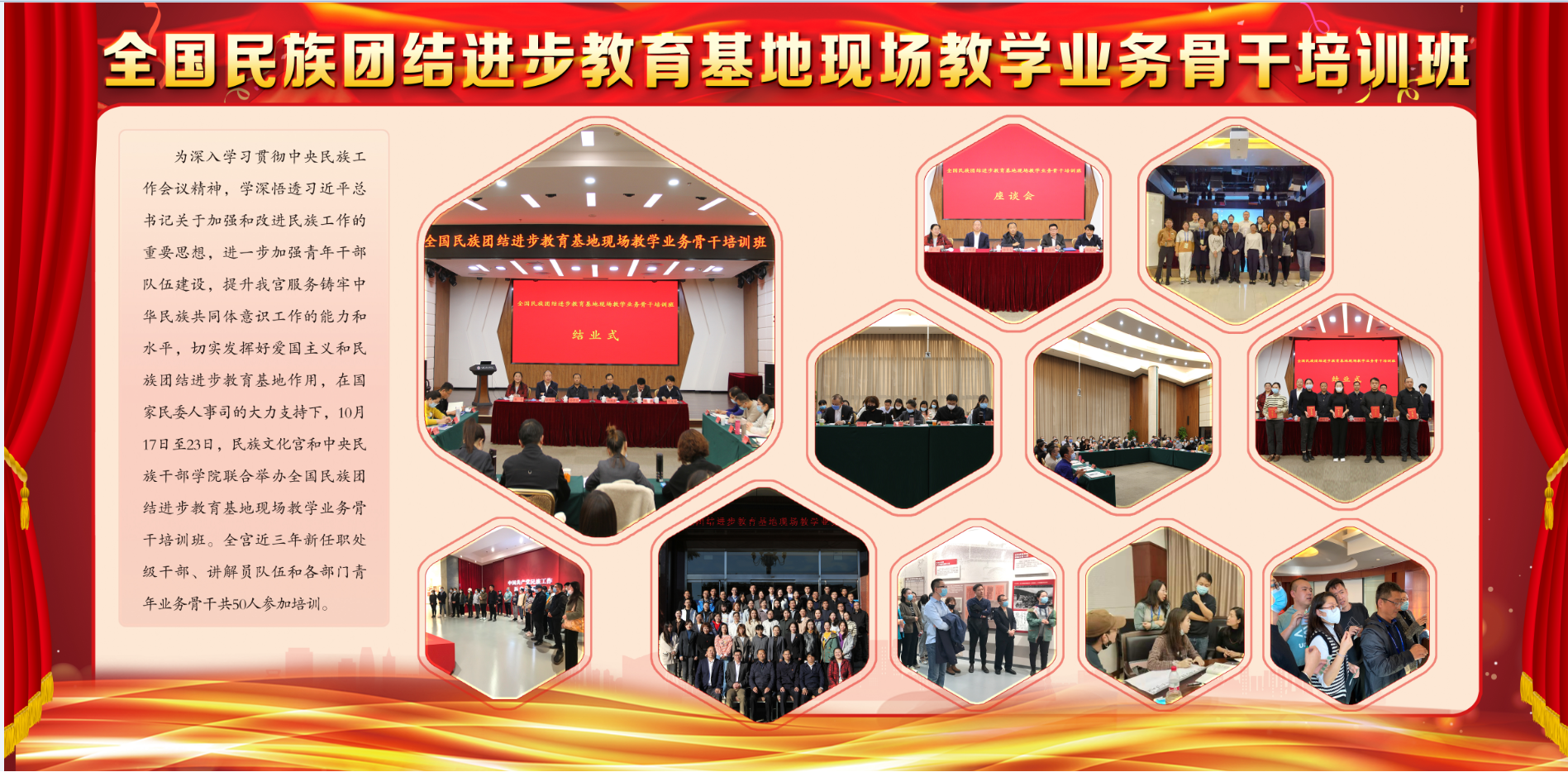 11月11日,按照民族文化宫党委工作部署,民族文化宫对院内橱窗中的两个展板进行了更新,新展板展示了全国民族团结进步教育基地现场教学业务骨干培训班的情况,为各族干部职工学习相关知识营造氛围。