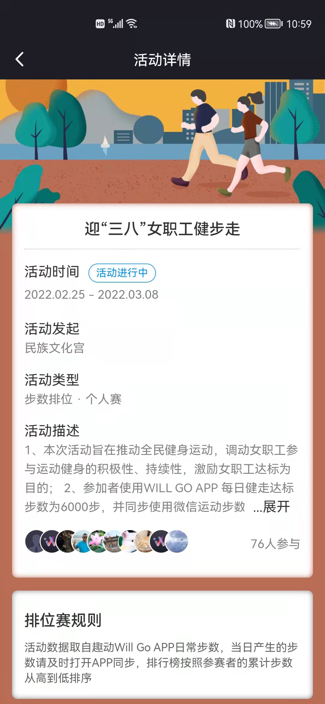 为迎接“三八”妇女节的到来,根据当前疫情防控有关要求,民族文化宫工会妇工委在三八节前夕举办迎“三八”女职工线上健步走活动。活动积极响应中华全国总工会号召,以 “中国梦 劳动美——永远跟党走 奋进新征程”为主题,运用趣动Will Go小程序,充分调动女职工广泛参与,以提升运动健身的积极性持续性、激励女职工线上运动达标为目的,科学健走,为推动全民健身运动营造浓厚氛围。