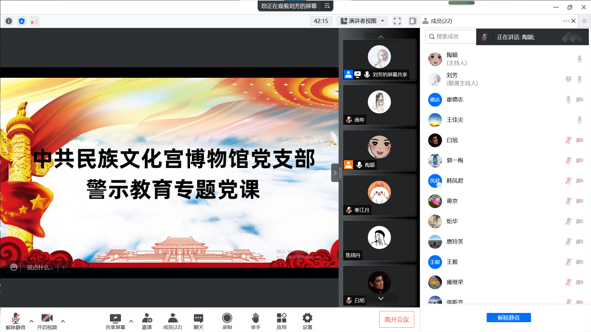 5月11日上午,根据《民族文化宫警示教育活动实施方案》的要求,博物馆党支部采用线上会议形式,组织开展警示教育专题党课。会议由党支部书记陶颖主持,党支部副书记崔德志以《持之以恒落实中央八项规定精神》为题作专题党课,支部全体党员参加。