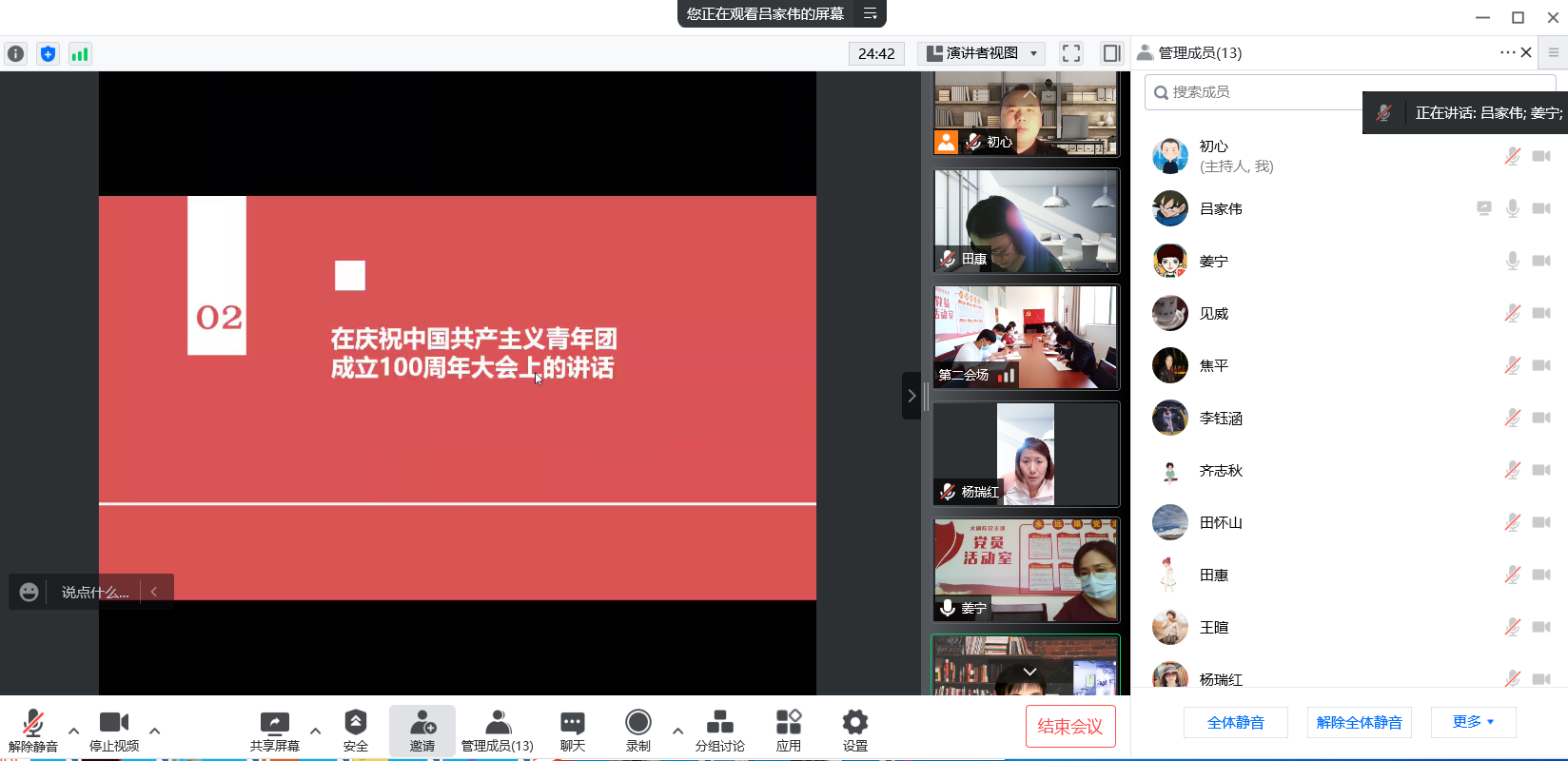 6月1日下午,大剧院党支部以视频会议形式组织召开集体学习。集中学习习近平总书记在庆祝中国共产主义青年团成立100周年大会上的重要讲话精神,学习《中国共产党廉洁自律准则》。党支部书记杨学海主持会议,全体党员干部职工、青年团员参加学习。
